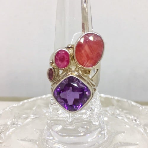 このパワフルなデザインには、大きなピローカットのアメジストに3石のルビーを組み合わせています。